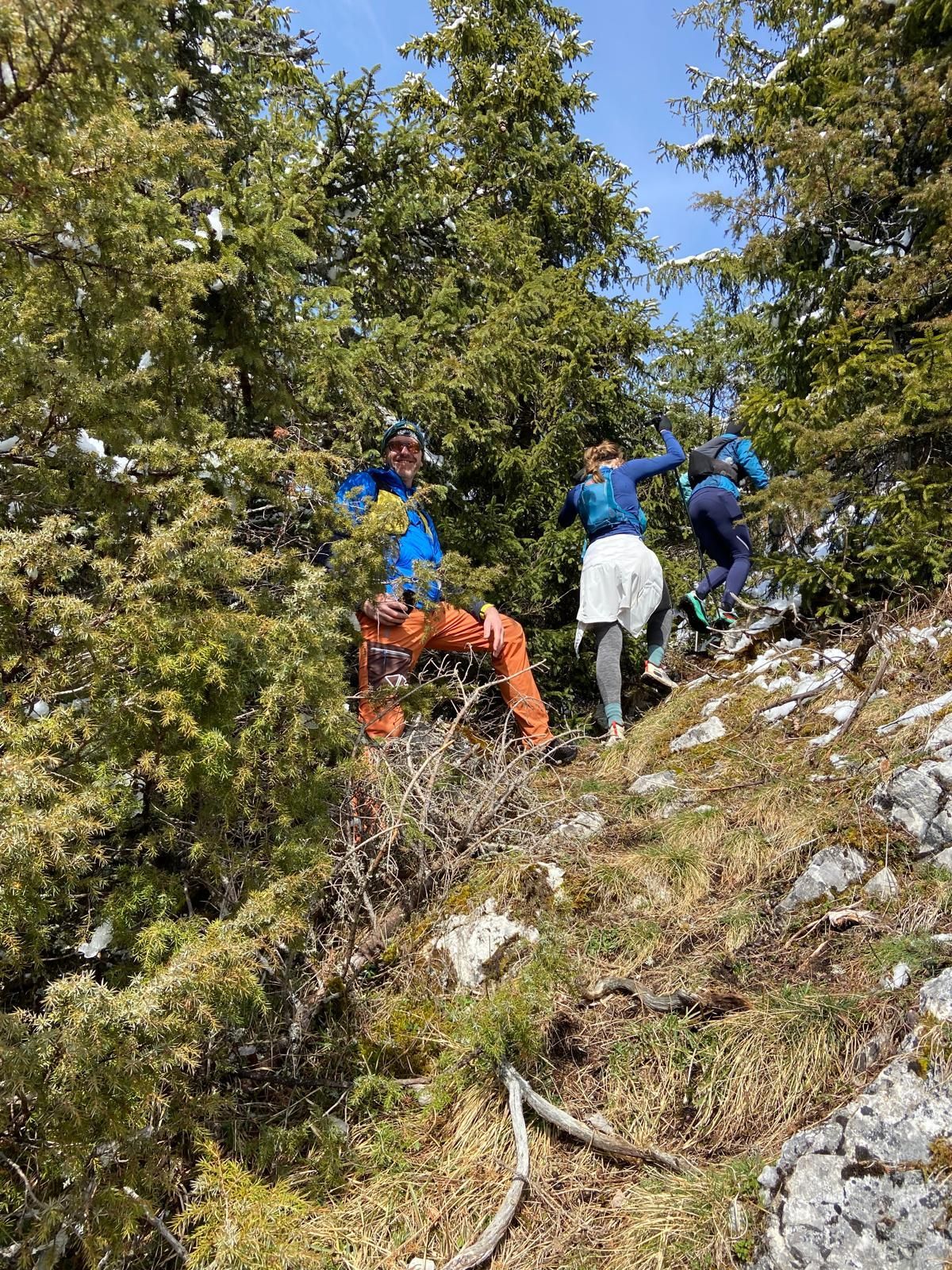 We liepen omhoog bij de waterval, zo'n 200-300 meter stijgen. Een pittige klim, waarna we de bergwand afliepen naar Plan des Feux. Hier daalden we tot het beekje, de Dranse. Team Chill was vooral erg druk met kletsen en elkaar leren kennen. Heel af en toe kwam er wel degelijk een korte trail-RUN-sessie aan te pas. Het beekje werd gevolgd tot we bij de parkeerplaats aankwamen van de Via Ferrata van des Saix de Moilène. Hier namen we een klein paadje omhoog, waarna het belangrijk was dat we vooral NIET de Via Ferrata zelf in gingen. Ook vandaag bleken we weer veel aan onze GPS-trackers te hebben, om ervoor te zorgen dat we niet van de route zouden afwijken. We werden overigens niet alleen nauwlettend in de gaten gehouden door de organisatie trouwens. Vanuit de lucht voelden we de ogen van de Keizer Adelaar branden. Een indrukwekkende vogel, die telkens opnieuw onze aandacht greep. We klommen een heel aantal meters, waarna de route zich verruimde met hulp-kettingen.