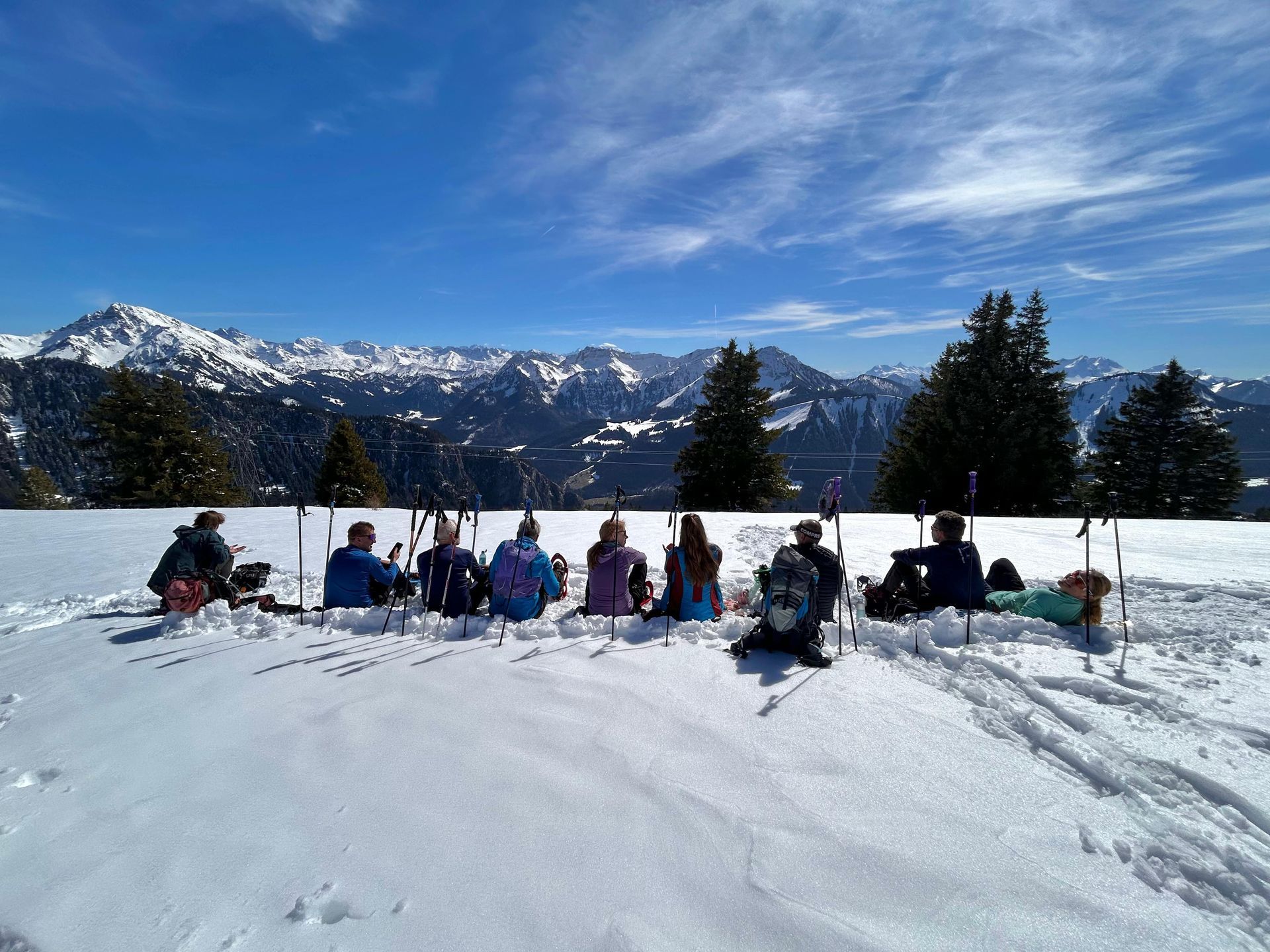 Onderweg stond het organisatieteam ons op sommige plekken op te wachten en werden we in onze oriëntatie-skills door hen ondersteund en d.m.v vlaggetjes. Eenmaal bij Chalet de la Raille aangekomen, namen we even uitgebreid de tijd om in het zonnetje van onze lunch te genieten. Toen kon de afdaling beginnen, wederom kwamen er kettingen aan te pas. Hier was het zaak dat we goed opletten, want de sneeuw was inmiddels blub, de paadjes smal en de helling steil... gevaarlijke combi!
